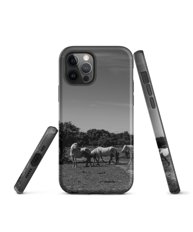 Entdecken Sie zeitlose Eleganz mit unseren "iPhone Black and White Horses Les Francophones". Inspiriert von einem faszinierenden Foto von Pferden in schwarz und weiß in einer Landschaft von Camargue, fügt diese Hülle einen Hauch von wilder Schönheit Ihrem iPhone.