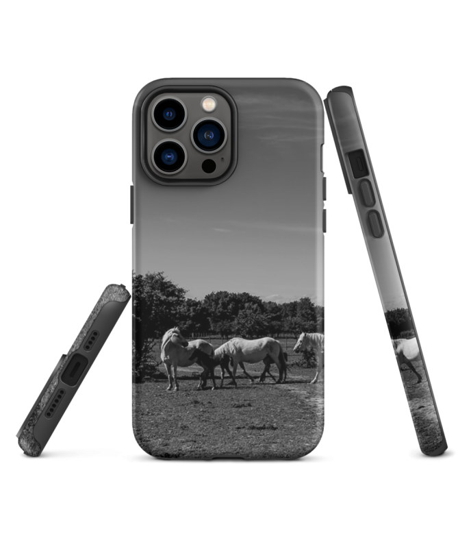 Entdecken Sie zeitlose Eleganz mit unseren "iPhone Black and White Horses Les Francophones". Inspiriert von einem faszinierenden Foto von Pferden in schwarz und weiß in einer Landschaft von Camargue, fügt diese Hülle einen Hauch von wilder Schönheit Ihrem iPhone.