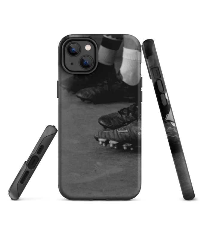 Erfassen Sie den Geist von Rugby mit dem iPhone CRAMPON Shell Les Francophones, mit einem Foto in Farbe verkettete Krampons in Nahaufnahme, für einen eleganten und sportlichen Schutz Ihres iPhone