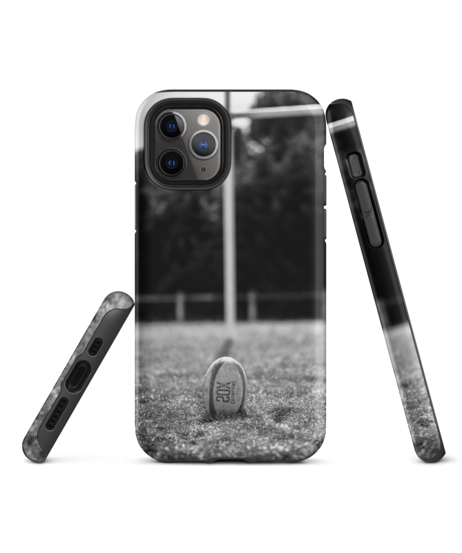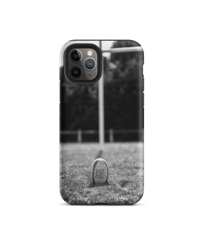 Die iPhone BUT Shell Les Francophones erfasst die intensität des rugbys mit einem schwarzen und weißen foto eines rugbyballs vor einem schuss zwischen den pfosten und symbolisiert den entscheidenden moment eines straffritts. Eine perfekte Mischung aus Stil und Funktionalität für Rugby-Enthusiasten.