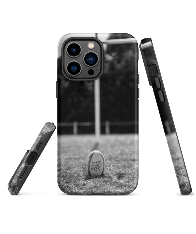Die iPhone BUT Shell Les Francophones erfasst die intensität des rugbys mit einem schwarzen und weißen foto eines rugbyballs vor einem schuss zwischen den pfosten und symbolisiert den entscheidenden moment eines straffritts. Eine perfekte Mischung aus Stil und Funktionalität für Rugby-Enthusiasten.