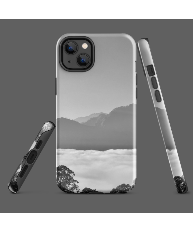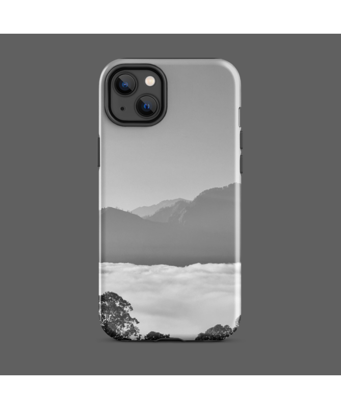 Erkunden Sie den balinesischen Himmel mit der FREDB NUAGE iPhone-Hülle, einem atemberaubenden Schwarz-Weiß-Foto der Bali-Berge, die majestätisch über den Wolken aufragen.