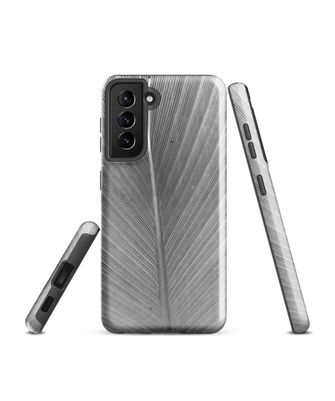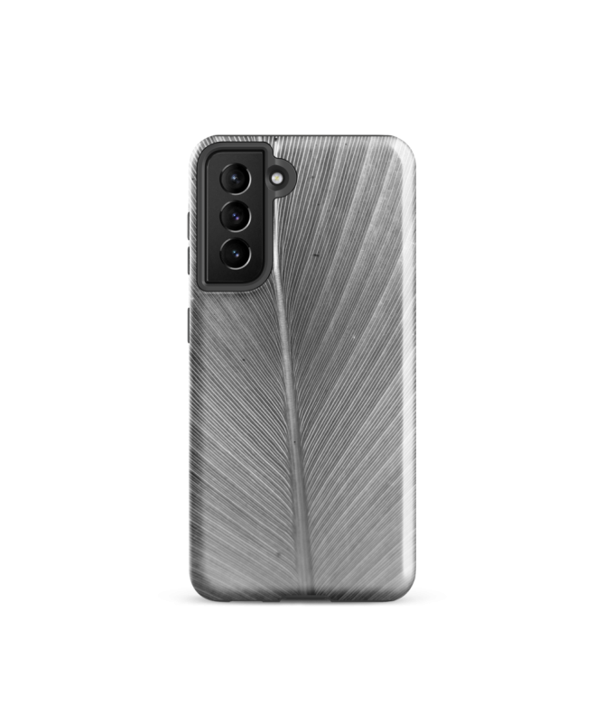 Entdecken Sie die beeindruckende Ästhetik der Natur mit der Samsung FREDB PALME-Hülle mit einem Schwarz-Weiß-Nahaufnahmefoto eines Palmblatts. Natürliche Eleganz zum...