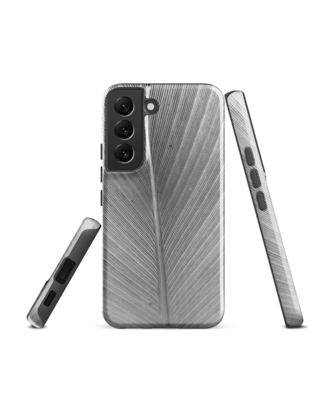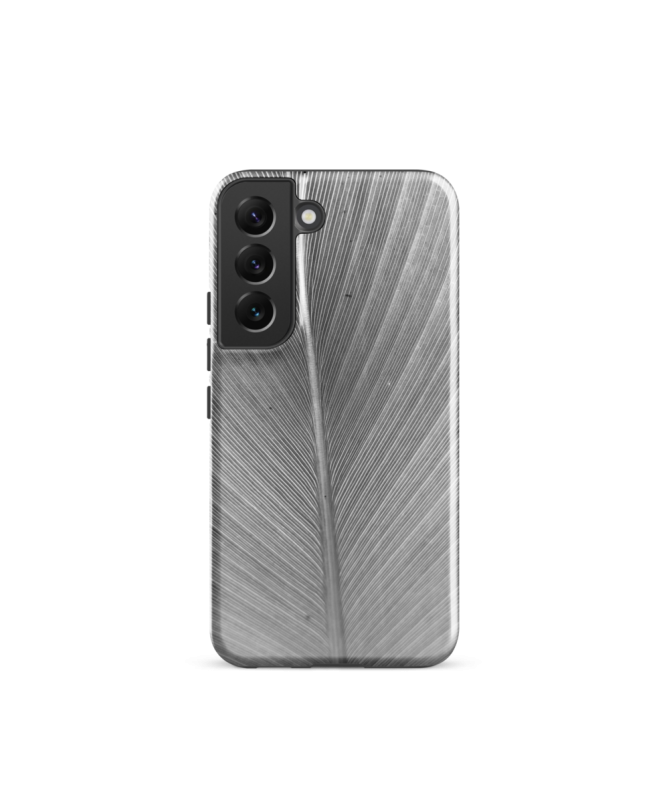Entdecken Sie die beeindruckende Ästhetik der Natur mit der Samsung FREDB PALME-Hülle mit einem Schwarz-Weiß-Nahaufnahmefoto eines Palmblatts. Natürliche Eleganz zum...