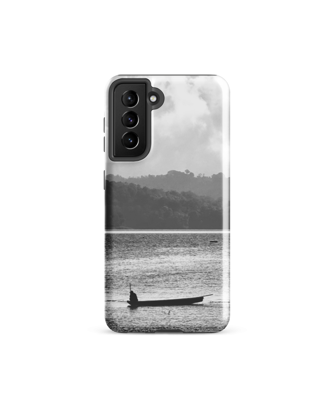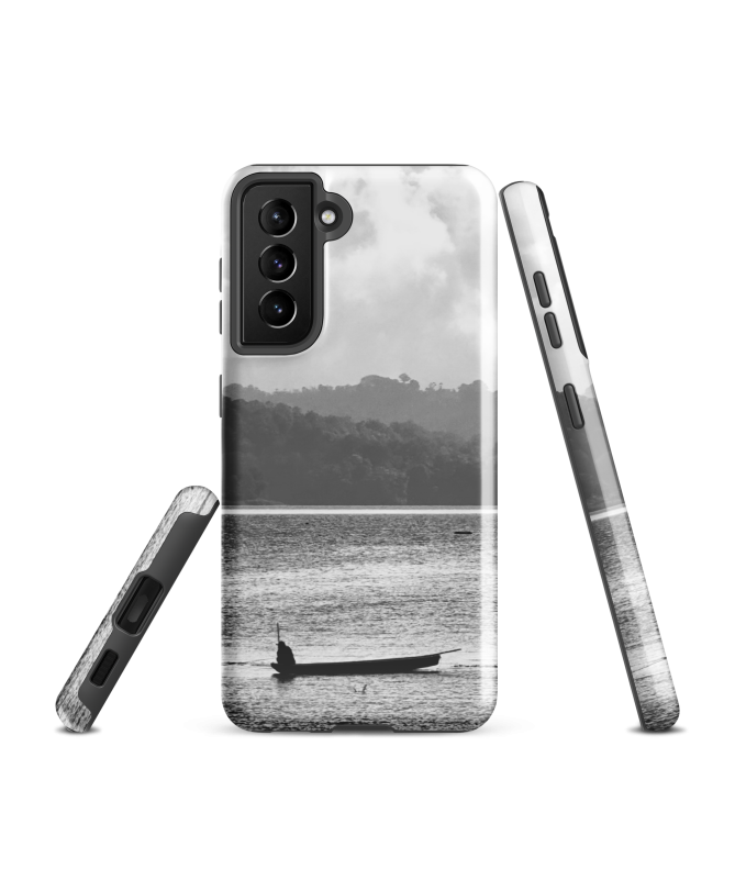 FREDB FISHERMAN Samsung-Hülle: Erleben Sie den Geist Balis mit dieser fesselnden schwarz-weißen Hülle, die einen einsamen Fischer auf seinem Boot zeigt, der auf dem Meer segelt. Eine...