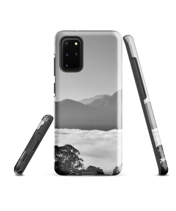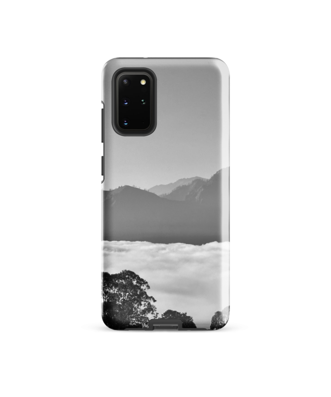Erkunden Sie den balinesischen Himmel mit der Samsung FREDB NUAGE-Hülle, einem atemberaubenden Schwarz-Weiß-Foto der Bali-Berge, die majestätisch über den Wolken aufragen.