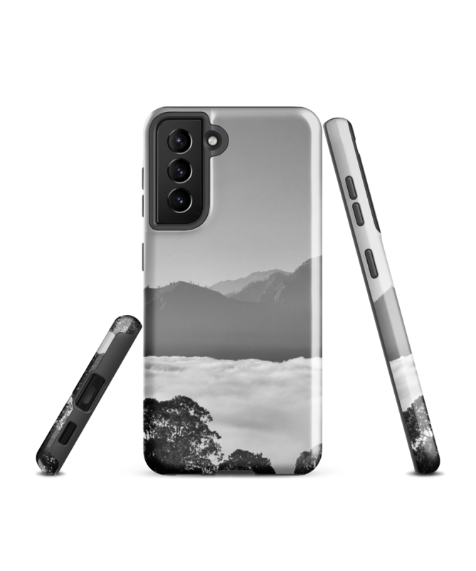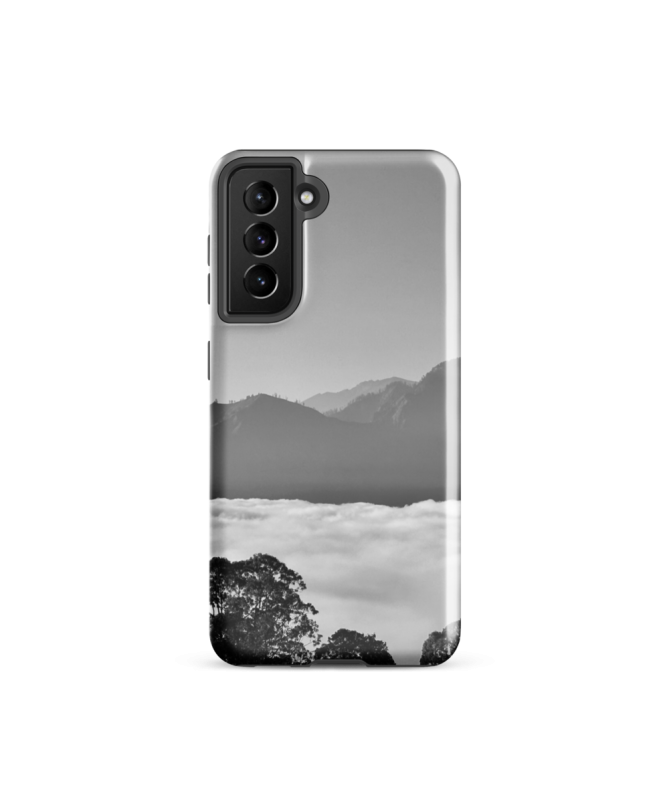 Erkunden Sie den balinesischen Himmel mit der Samsung FREDB NUAGE-Hülle, einem atemberaubenden Schwarz-Weiß-Foto der Bali-Berge, die majestätisch über den Wolken aufragen.