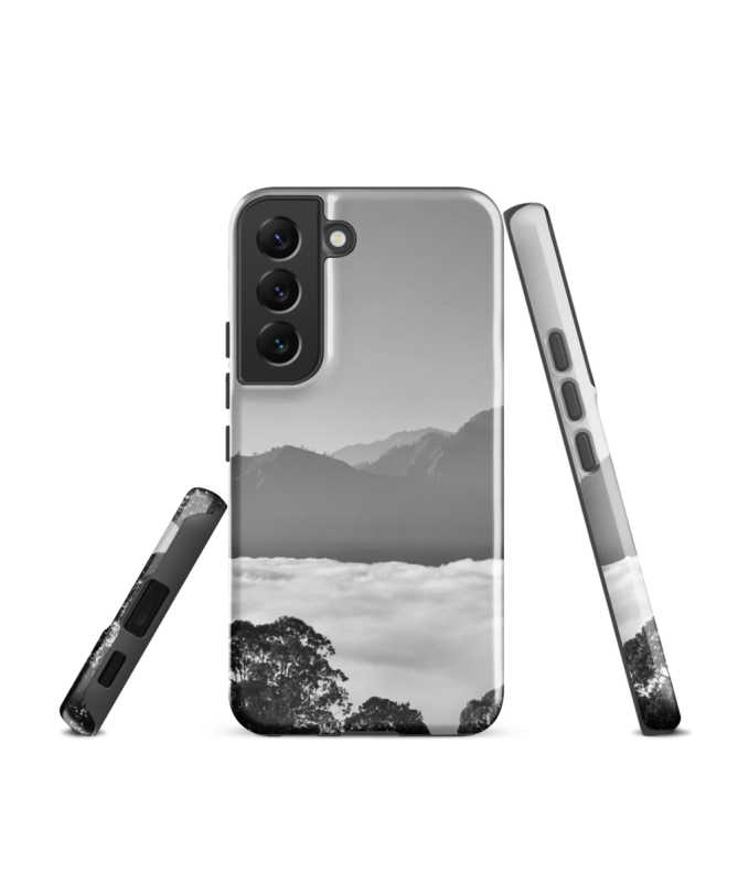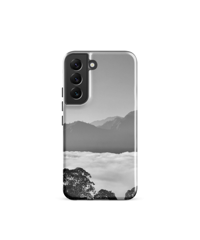 Erkunden Sie den balinesischen Himmel mit der Samsung FREDB NUAGE-Hülle, einem atemberaubenden Schwarz-Weiß-Foto der Bali-Berge, die majestätisch über den Wolken aufragen.