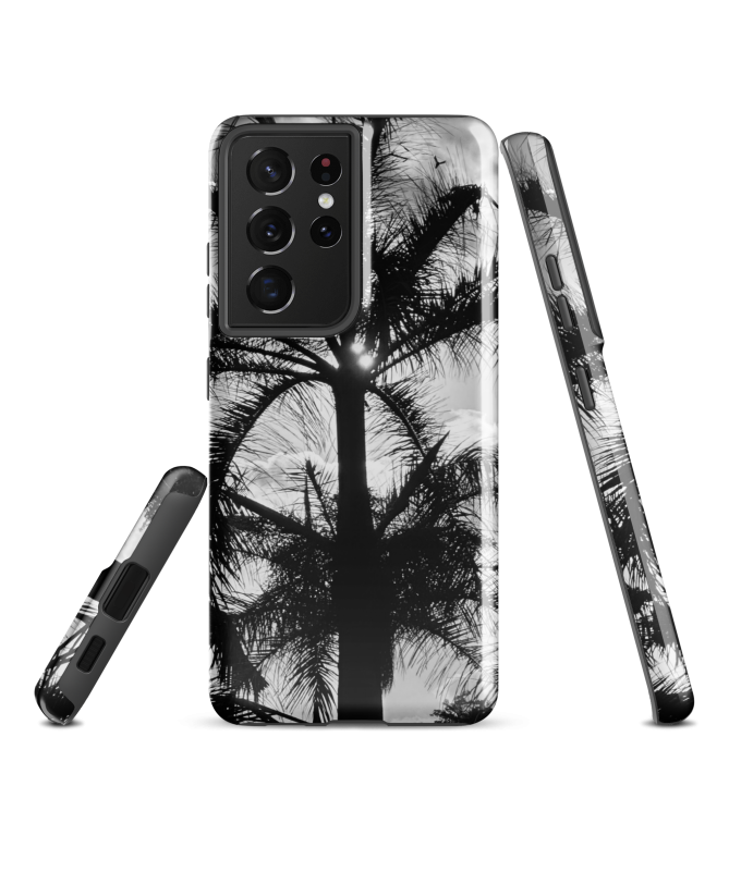 Die FREDB SPIDER Samsung-Hülle: Erinnern Sie sich an die geheimnisvolle Schönheit Balis mit diesem Schwarz-Weiß-Foto einer Palme von FRED BALISTER, das an die eleganten Beine einer...