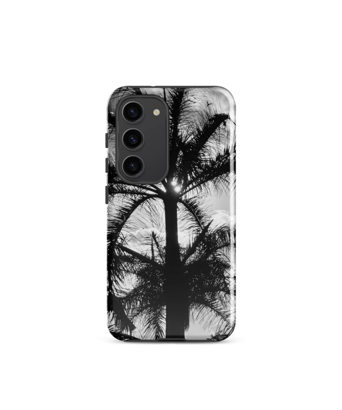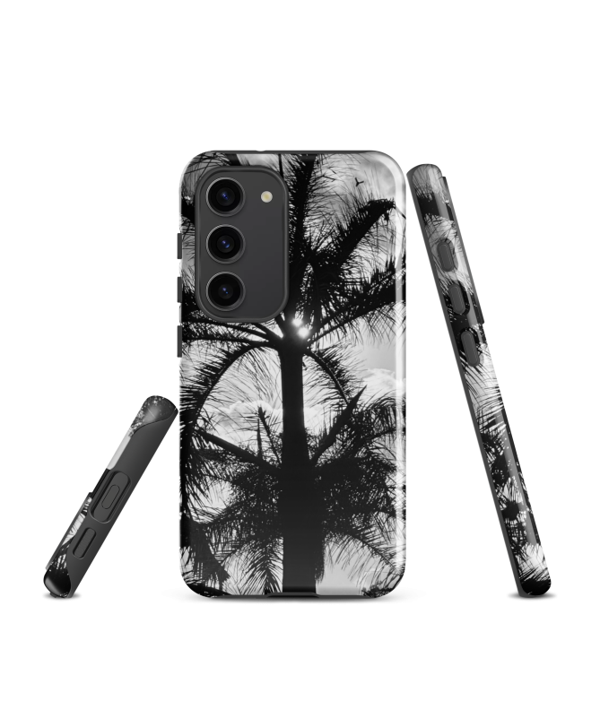 Die FREDB SPIDER Samsung-Hülle: Erinnern Sie sich an die geheimnisvolle Schönheit Balis mit diesem Schwarz-Weiß-Foto einer Palme von FRED BALISTER, das an die eleganten Beine einer...