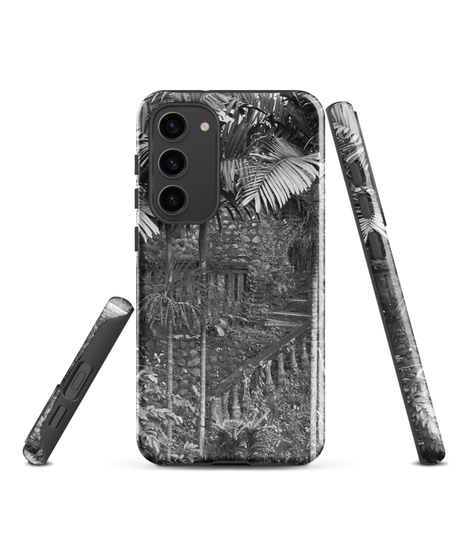 Entdecken Sie die Ruhe der balinesischen Natur mit der Samsung FREDB ESCALE-Hülle, inspiriert von einem Schwarzweißfoto von FRED BALISTER, das ein friedliches Haus im Herzen des...