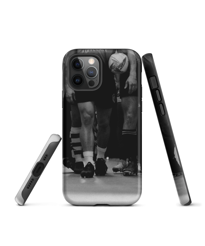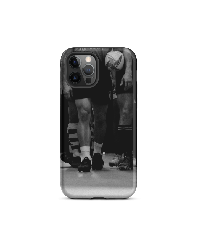 Experimenta la intensidad del rugby con el iPhone "RUCKBIS" Les Francophones, capturando la energía de un ruck en blanco y negro para los amantes del deporte.