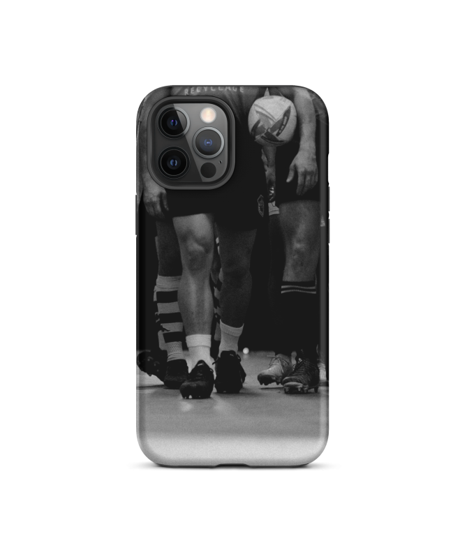 Experimenta la intensidad del rugby con el iPhone "RUCKBIS" Les Francophones, capturando la energía de un ruck en blanco y negro para los amantes del deporte.