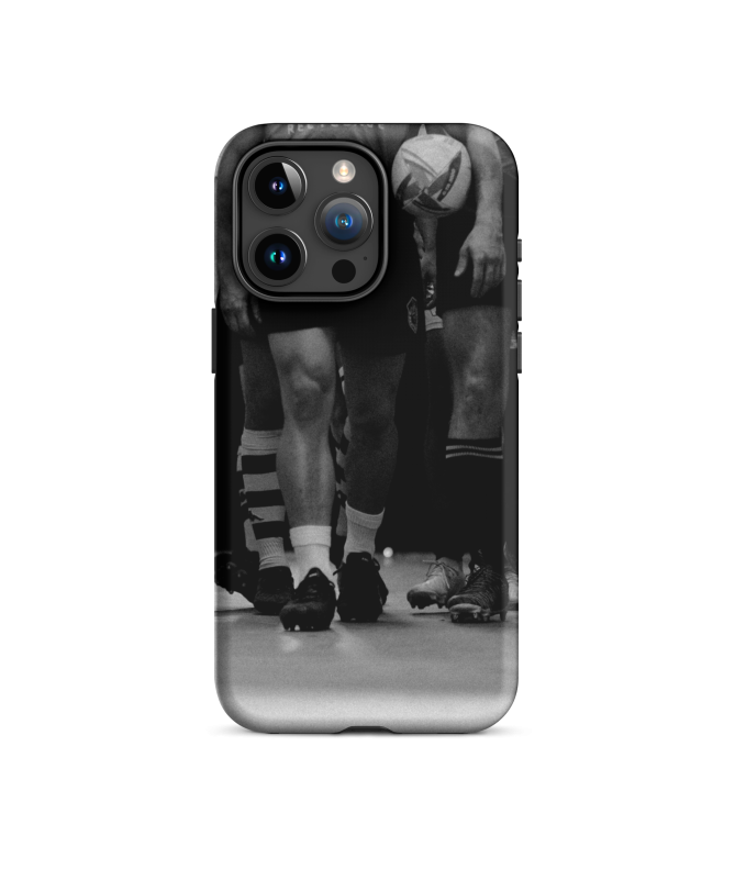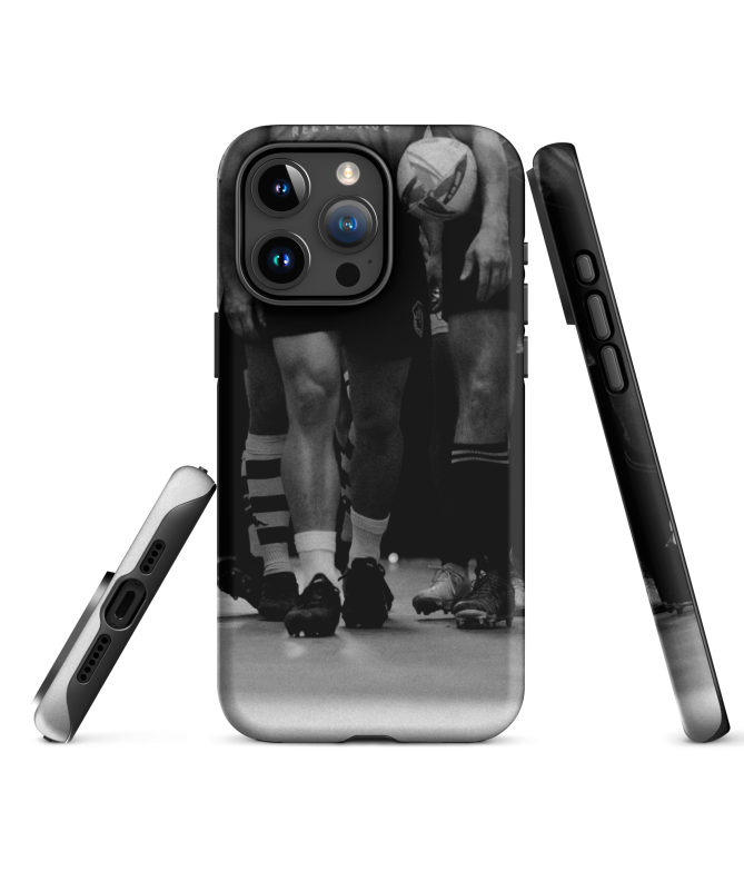 Experimenta la intensidad del rugby con el iPhone "RUCKBIS" Les Francophones, capturando la energía de un ruck en blanco y negro para los amantes del deporte.