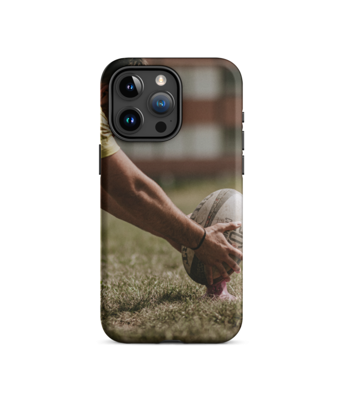 La cubierta del iPhone BALLTIR Les Francophones destaca el emocionante momento en que un jugador se prepara para lanzar un penalti en el rugby. La foto retrata la fase de preparación para el posicionamiento del globo. Con colores brillantes y un diseño distintivo, este casco es una opción ideal para los aficionados al deporte. Ofrece una protección fiable a su teléfono mientras refleja su afición por el rugby.
