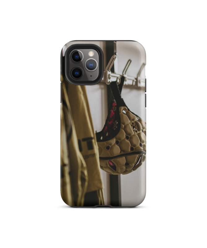 Captura el espíritu del rugby con el casco iPhone CASCO Los francófonos, destacando un casco emblemático de este deporte en los vestuarios de los jugadores. Una fusión perfecta de pasión deportiva y protección elegante para su teléfono