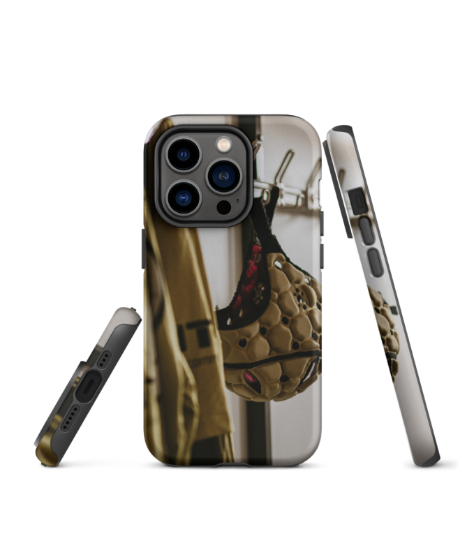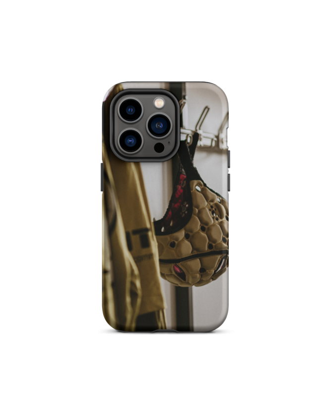 Captura el espíritu del rugby con el casco iPhone CASCO Los francófonos, destacando un casco emblemático de este deporte en los vestuarios de los jugadores. Una fusión perfecta de pasión deportiva y protección elegante para su teléfono