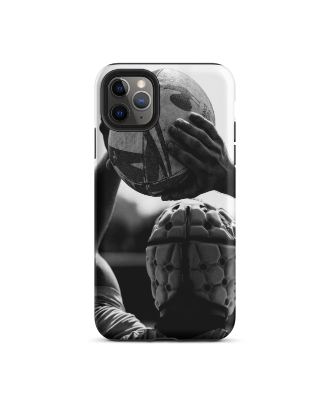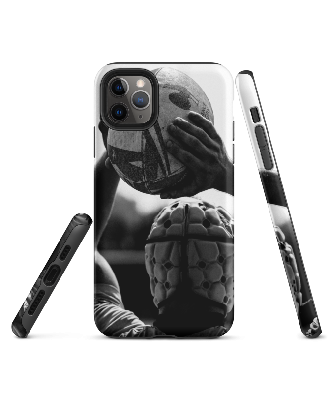 Muestra tu pasión por el rugby con la caja iPhone MAINBALL Los francófonos de nuestra gama Copa Mundial de Rugby, destacando a un jugador sosteniendo el balón con determinación. Una protección elegante para los fanáticos de este deporte emblemático.