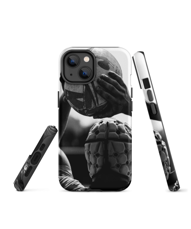 Muestra tu pasión por el rugby con la caja iPhone MAINBALL Los francófonos de nuestra gama Copa Mundial de Rugby, destacando a un jugador sosteniendo el balón con determinación. Una protección elegante para los fanáticos de este deporte emblemático.
