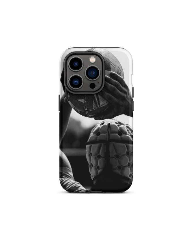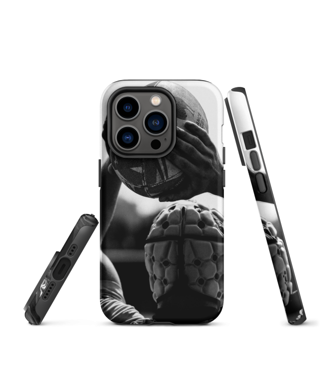 Muestra tu pasión por el rugby con la caja iPhone MAINBALL Los francófonos de nuestra gama Copa Mundial de Rugby, destacando a un jugador sosteniendo el balón con determinación. Una protección elegante para los fanáticos de este deporte emblemático.