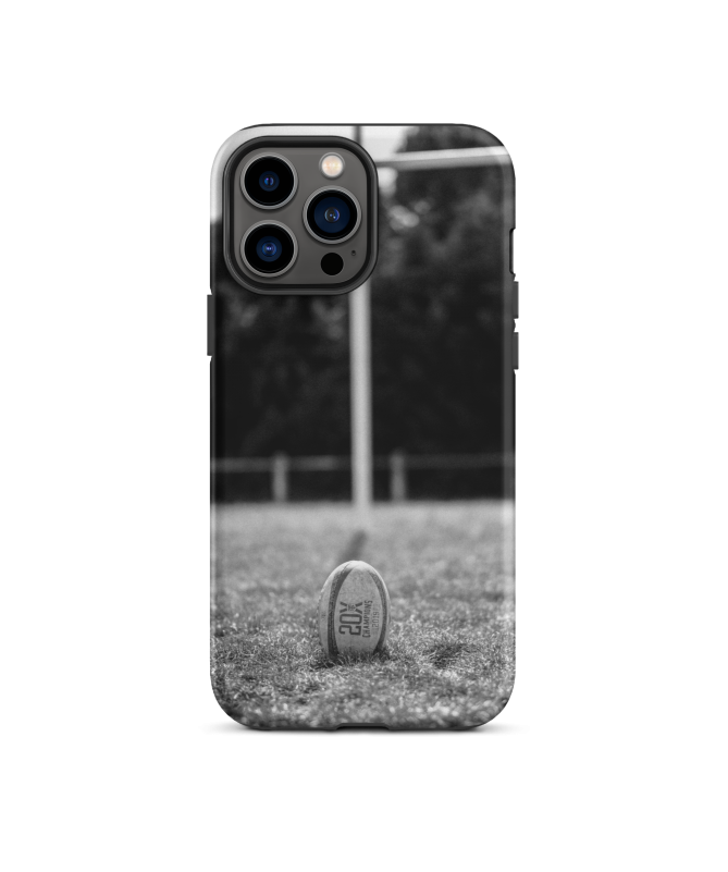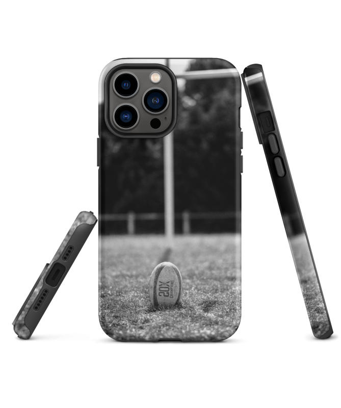 La caja del iPhone BUT Les Francophones captura la intensidad del rugby con una foto en blanco y negro de un balón de rugby en su lugar antes de un tiro entre los postes, simbolizando el momento decisivo de un penal. Una combinación perfecta de estilo y funcionalidad para los amantes del rugby.