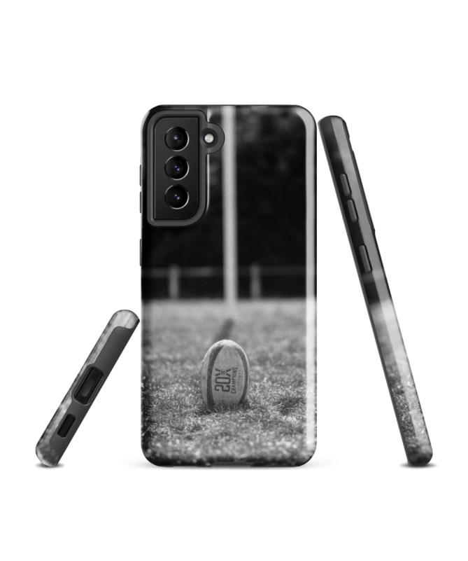 La cáscara de Samsung BUT Les Francophones captura la intensidad del rugby con una foto en blanco y negro de un balón de rugby en su lugar antes de un tiro entre los postes, simbolizando el momento decisivo de un penal. Una combinación perfecta de estilo y funcionalidad para los amantes del rugby.