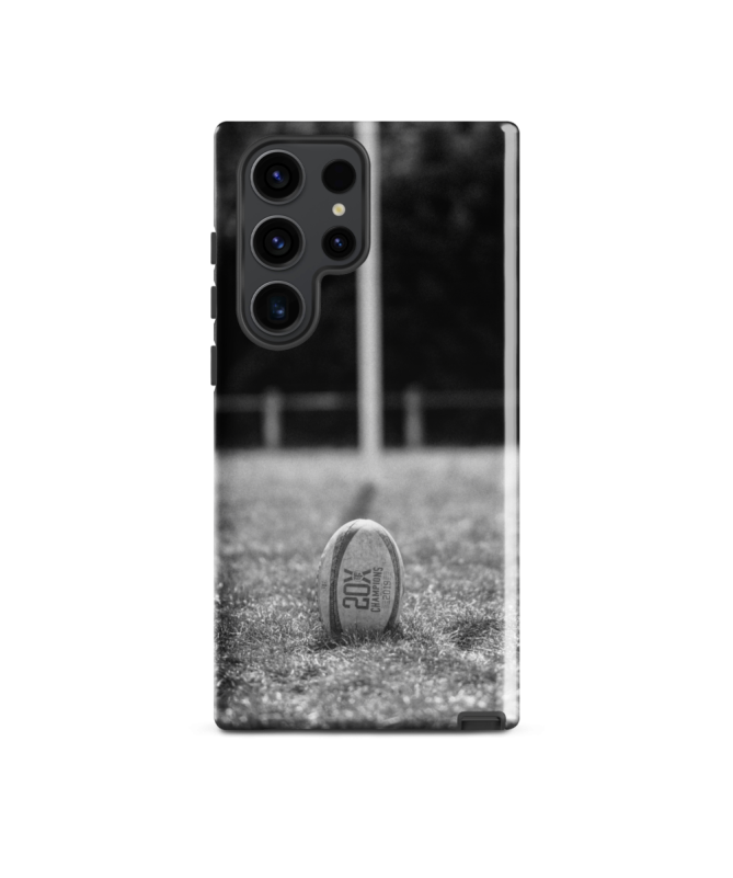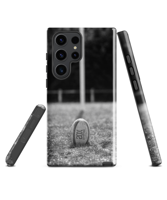 La cáscara de Samsung BUT Les Francophones captura la intensidad del rugby con una foto en blanco y negro de un balón de rugby en su lugar antes de un tiro entre los postes, simbolizando el momento decisivo de un penal. Una combinación perfecta de estilo y funcionalidad para los amantes del rugby.