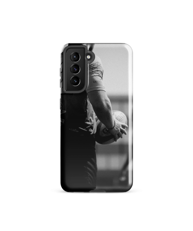 Muestra tu pasión por el rugby con el casco Samsung MAINBALL Les Francophones de nuestra gama de la Copa Mundial de Rugby, mostrando a un jugador sosteniendo el balón con determinación....