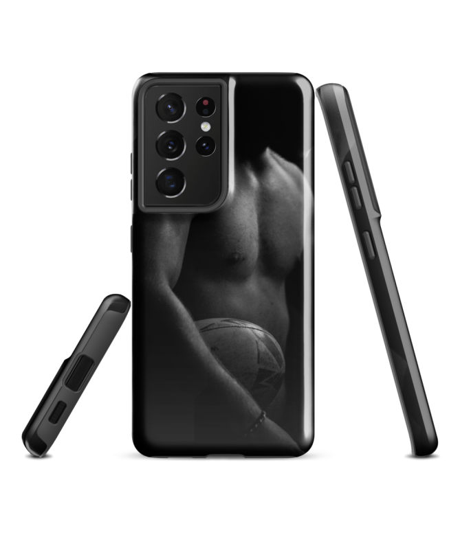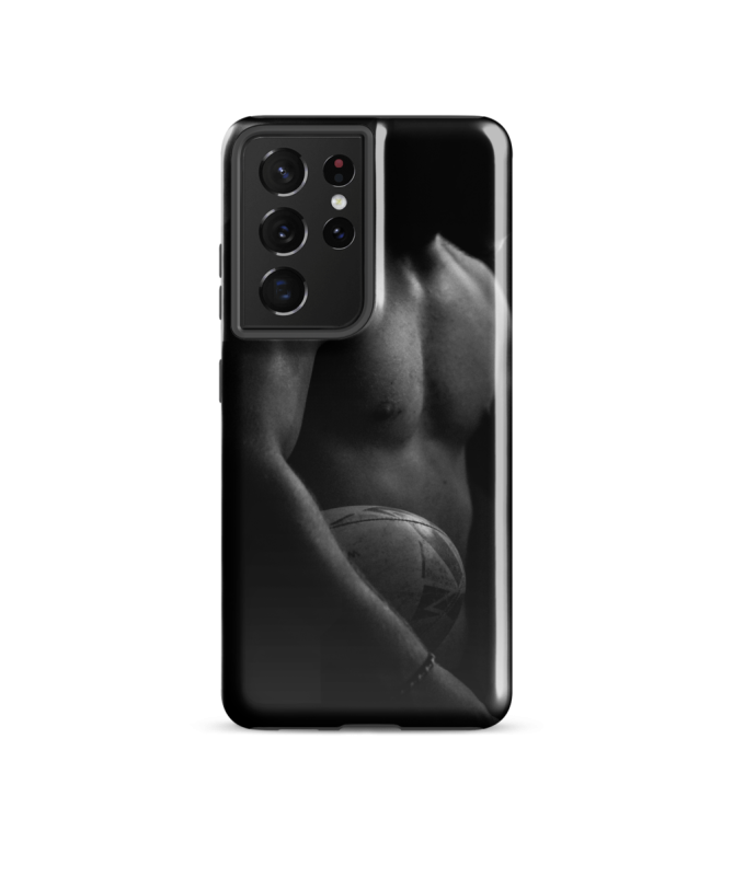 Muestre su pasión por el rugby con elegancia con el casco Samsung TORSE Les Francophones. Una foto en blanco y negro de un torso de jugador de rugby captura el poder del deporte,...