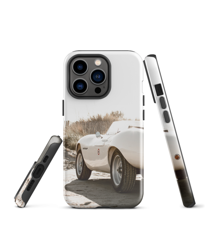 Sumérgete en la elegancia del automóvil con nuestro casco "iPhone Auto Plage Les Francophones". Este casco muestra un legendario Jaguar en una encantadora playa del sur de Francia.