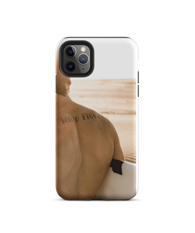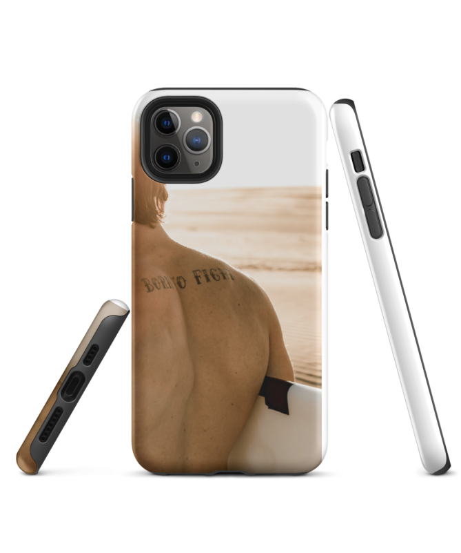 Experimenta la sensación del océano con el casco "iPhone Surf Les Francophones", con nuestro modelo Sacha de espalda, listo para dominar las olas en el surf. Este elegante casco protege tu iPhone mientras expresa tu pasión por el surf.