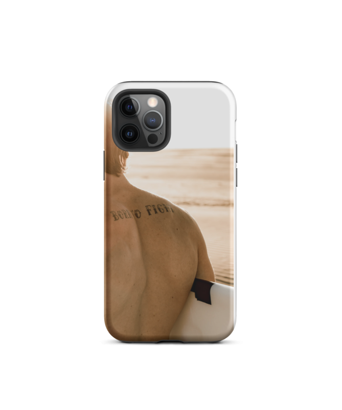 Experimenta la sensación del océano con el casco "iPhone Surf Les Francophones", con nuestro modelo Sacha de espalda, listo para dominar las olas en el surf. Este elegante casco protege tu iPhone mientras expresa tu pasión por el surf.