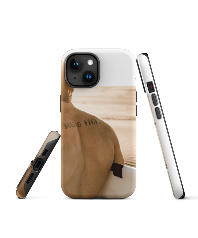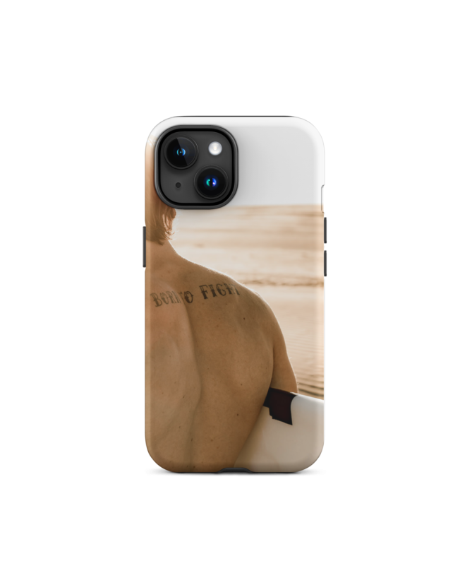 Experimenta la sensación del océano con el casco "iPhone Surf Les Francophones", con nuestro modelo Sacha de espalda, listo para dominar las olas en el surf. Este elegante casco protege tu iPhone mientras expresa tu pasión por el surf.