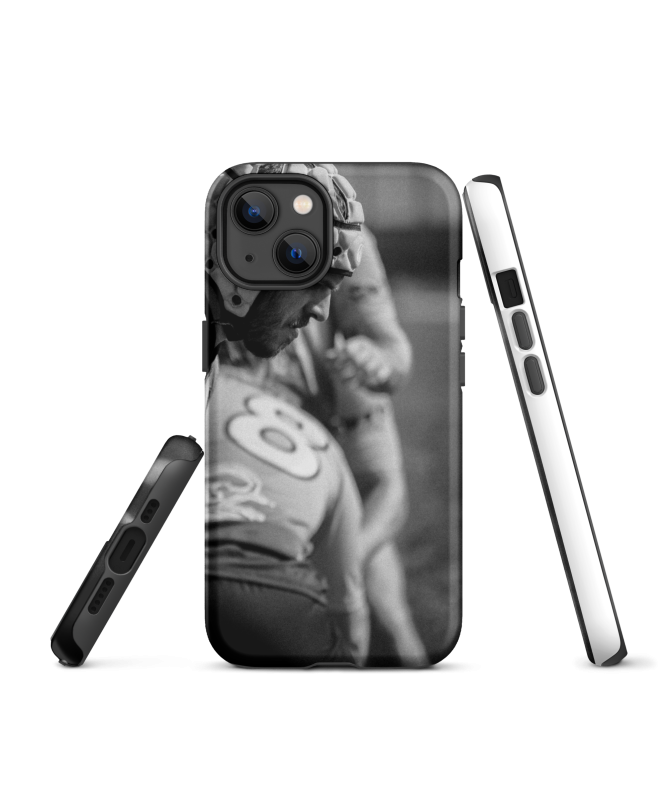 Sumérgete en el corazón de la acción del rugby con el iPhone RUCK Les Francophones. Este casco, que forma parte de nuestra colección especial Copa Mundial de Rugby en Francia, presenta una sorprendente foto en blanco y negro de un ruck en formación. Un tercer centro de línea está apoyado por sus compañeros de equipo, capturando la intensidad y camaradería del juego.