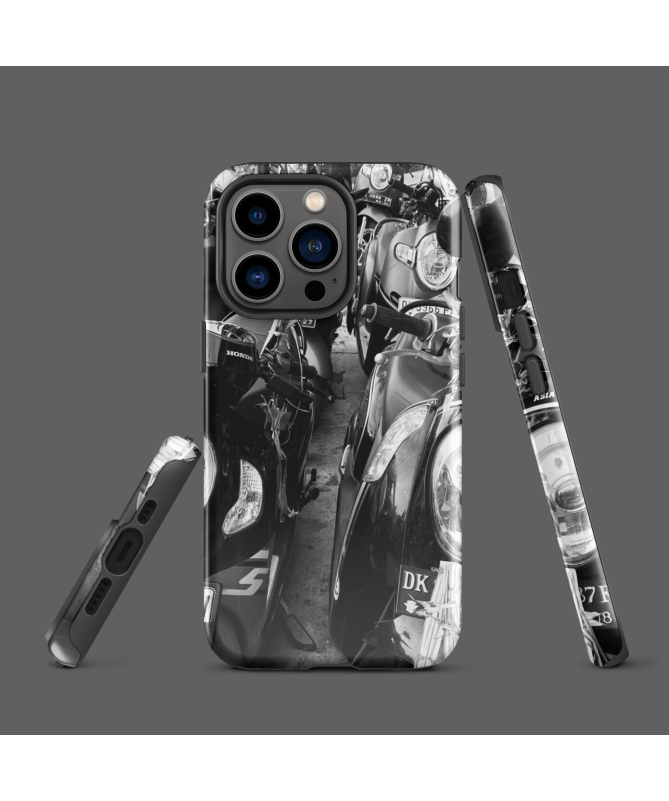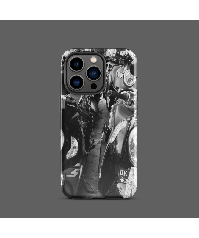 Descubra el encanto urbano de Bali con nuestra funda para iPhone FREDB SCOOT, que captura la sinfonía visual de scooters alineados en un estacionamiento, una foto de FRED...