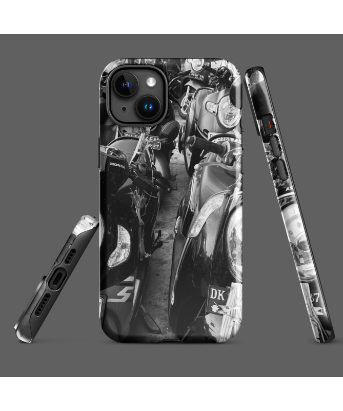 Descubra el encanto urbano de Bali con nuestra funda para iPhone FREDB SCOOT, que captura la sinfonía visual de scooters alineados en un estacionamiento, una foto de FRED...