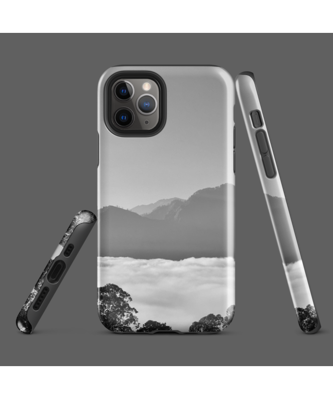 Explore los cielos balinés con la caja de nuage de iPhone Fredb, una impresionante foto en blanco y negro de las montañas Bali que emergen majestuosamente sobre las nubes.