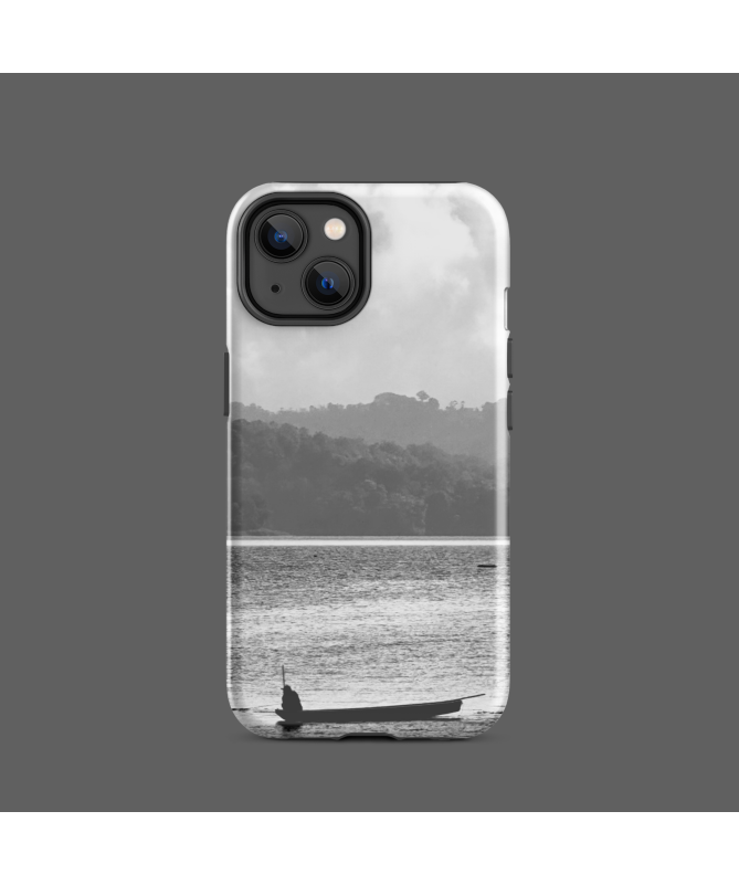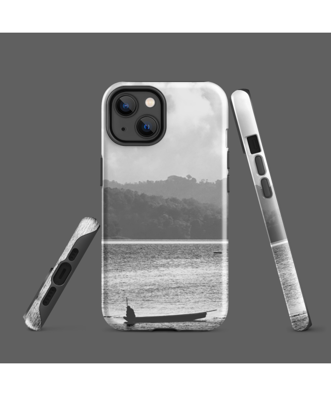 FREDB PECHEUR iPhone shell: Vive el espíritu de Bali con este cautivador casco en blanco y negro, destacando un solitario pescador en su barco, navegando en el océano. Un homenaje a la...