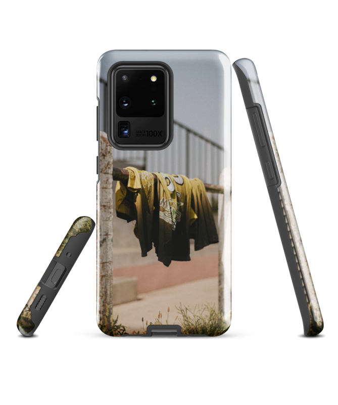Sumérgete en el ambiente vibrante del rugby con el casco Samsung MAILLOT Les Francophones. Esta obra de arte en imagen capta el espíritu competitivo del rugby a través de camisetas de colores cuidadosamente colgadas de una barandilla después de un partido intenso. Los detalles cautivadores de esta foto a color realzan la belleza bruta del deporte, permitiendo que su teléfono tenga un toque de pasión deportiva.