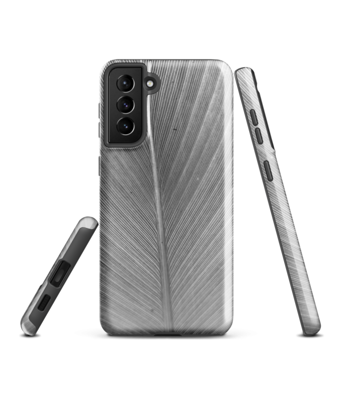 Explora la sorprendente estética de la naturaleza con el estuche Samsung FREDB PALME, que presenta una fotografía en primer plano en blanco y negro de una hoja de palma. Elegancia...