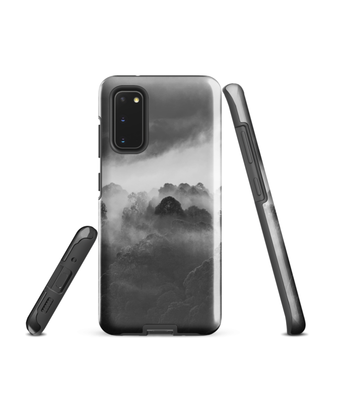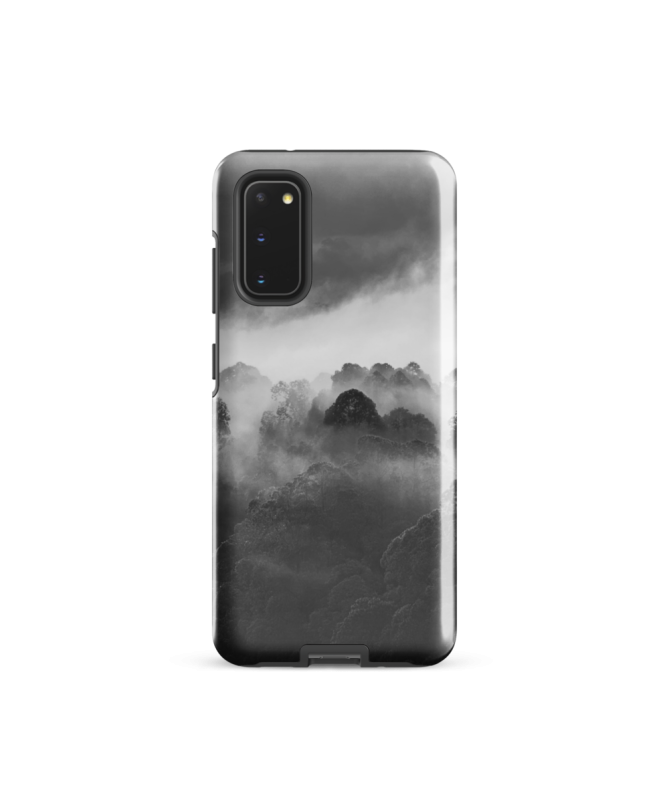 Explora la misteriosa belleza del bosque balinés con la funda Samsung FREDB POINTE, que captura en blanco y negro la enigmática silueta de un árbol que emerge de la niebla.