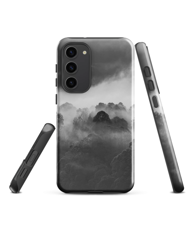 Explora la misteriosa belleza del bosque balinés con la funda Samsung FREDB POINTE, que captura en blanco y negro la enigmática silueta de un árbol que emerge de la niebla.