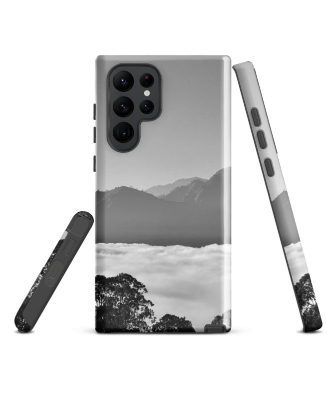 Explora los cielos balineses con la funda Samsung FREDB NUAGE, una impresionante fotografía en blanco y negro de las montañas de Bali emergiendo majestuosamente sobre las...