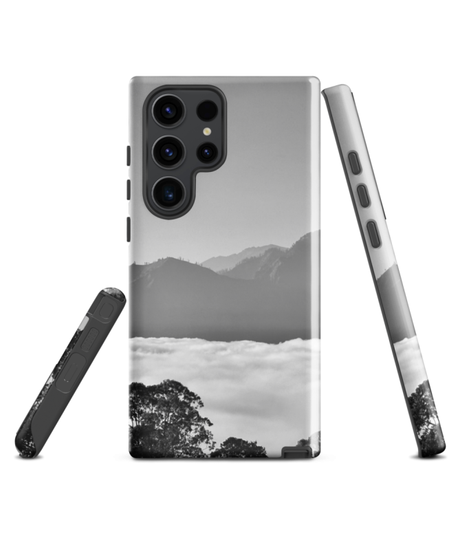 Explora la majestuosidad de las montañas balinesas con el estuche Samsung FREDB FALAISE, capturando la grandeza de los acantilados en blanco y negro, una simbiosis perfecta de protección y estética.