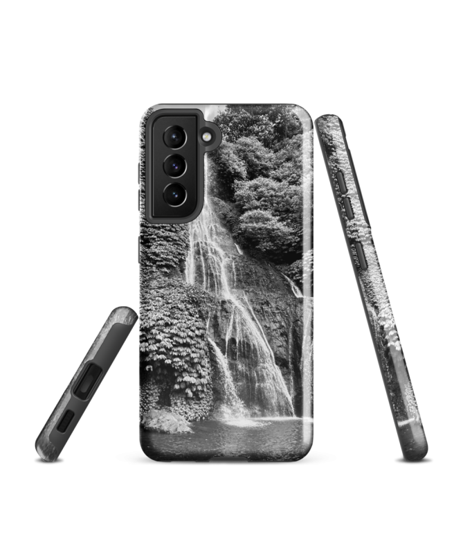 Sumérgete en la naturaleza con la funda Samsung FREDB CHUTE. Una fotografía en blanco y negro que captura la majestuosidad de las cascadas en el corazón de la jungla balinesa.