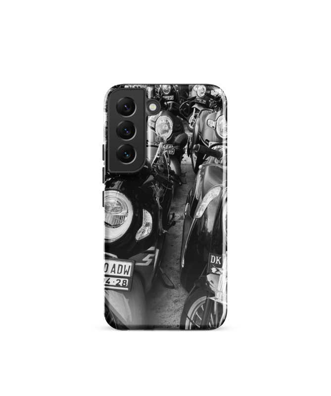Descubra el encanto urbano de Bali con nuestra funda para Samsung FREDB SCOOT, que captura la sinfonía visual de scooters alineados en un estacionamiento, una foto de FRED...