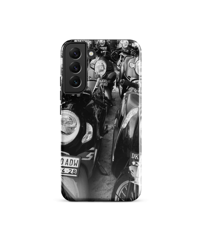 Descubra el encanto urbano de Bali con nuestra funda para Samsung FREDB SCOOT, que captura la sinfonía visual de scooters alineados en un estacionamiento, una foto de FRED...