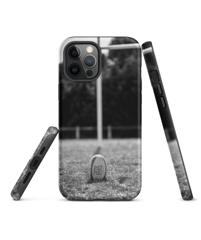 La coque iPhone BUT Les Francophones capture l'intensité du rugby avec une photo en noir et blanc d'un ballon de rugby en place avant un tir entre les poteaux, symbolisant le moment décisif d'un coup de pied de pénalité. Un mélange parfait de style et de fonctionnalité pour les amateurs de rugby.