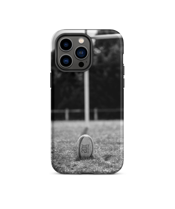 La coque iPhone BUT Les Francophones capture l'intensité du rugby avec une photo en noir et blanc d'un ballon de rugby en place avant un tir entre les poteaux, symbolisant le moment décisif d'un coup de pied de pénalité. Un mélange parfait de style et de fonctionnalité pour les amateurs de rugby.