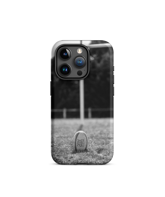 La coque iPhone BUT Les Francophones capture l'intensité du rugby avec une photo en noir et blanc d'un ballon de rugby en place avant un tir entre les poteaux, symbolisant le moment décisif d'un coup de pied de pénalité. Un mélange parfait de style et de fonctionnalité pour les amateurs de rugby.